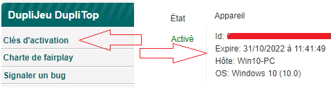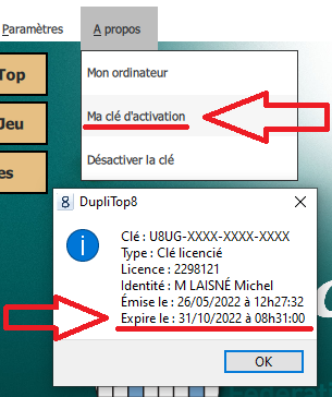 Notez qu'un accès à internet de DP8 doit être exécuté au minimum tous les 30 jours. Il serait souhaitable qu'une information claire indique le nombre de jours restant avant qu'il ne faille reculer le moment « l'expiration de la clé » |