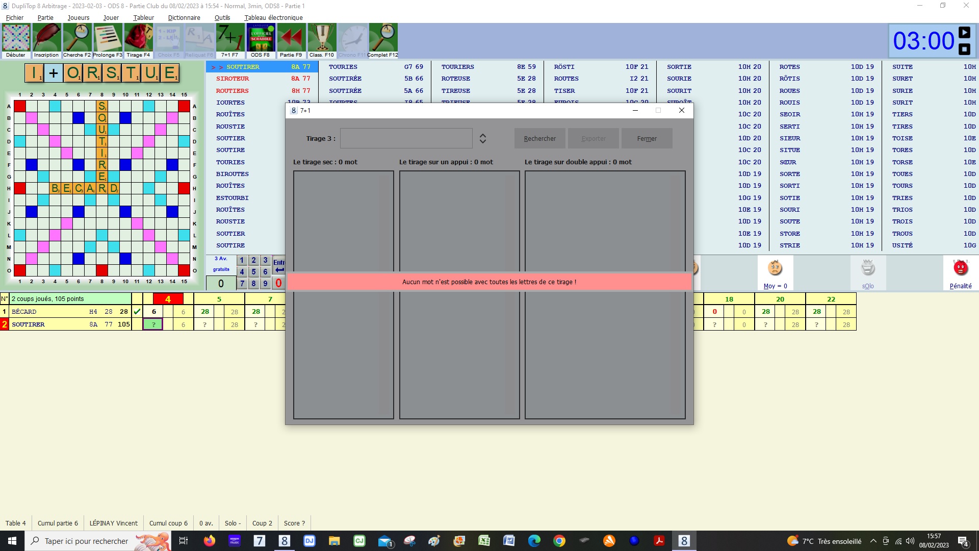 Exemple en cours de la partie jointe le tirage du coup 15 « EEMVT?X » les flèches se trouvent à l'intérieur des 15 solutions possibles en 11 lettres et il faut donc cliquer sur OK pour fermer la fenêtre.