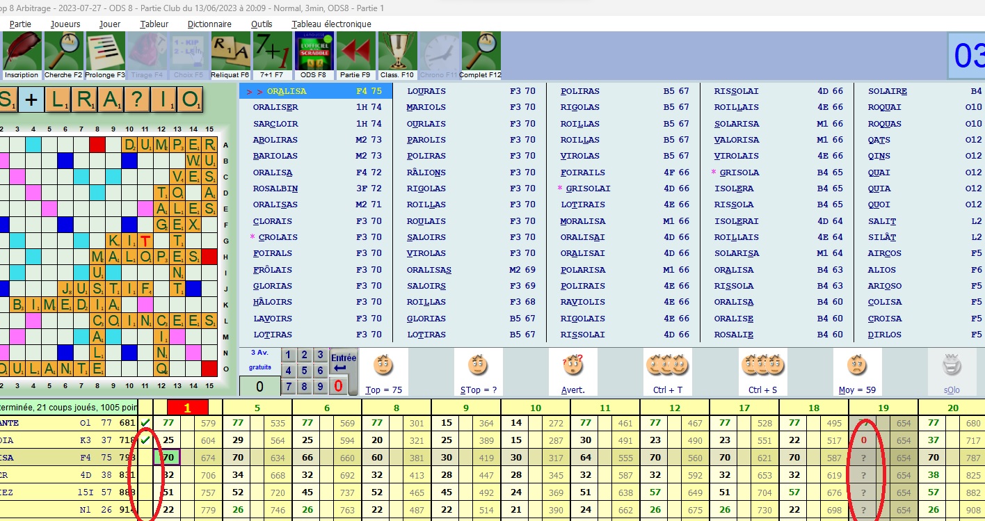 Le joueur ayant abandonné apparait bien en grisé avec un point d'interrogation sur chaque coup où il est absent mais même si toutes les autres tables ont été arbitrées, la coche verte n'apparait pas pour nous indiquer la validation du coup arbitré. |