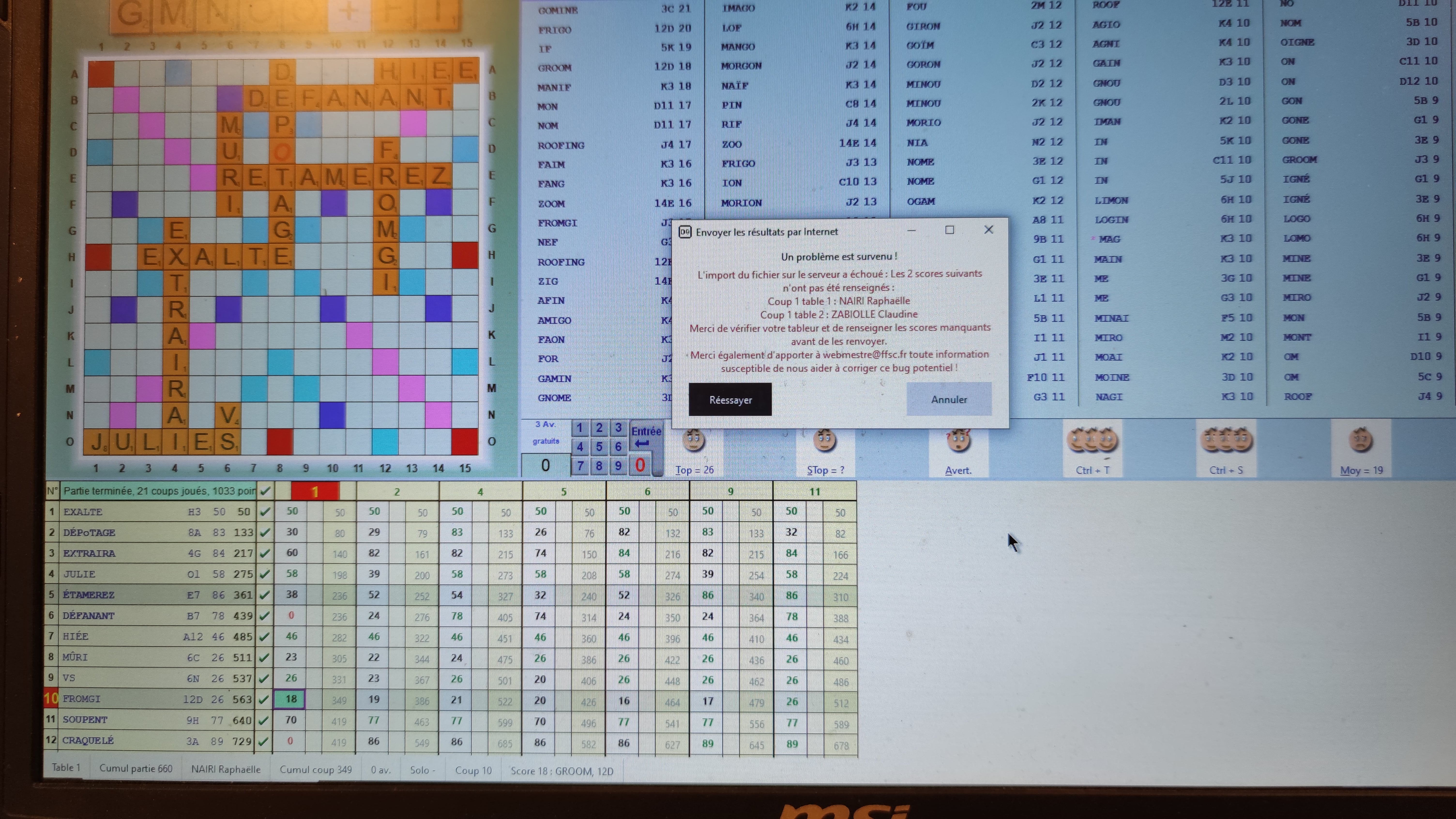 | Description | Bonjour, 3ème partie arbitrée, 3ème plantage à l'affichage du 1er coup. J'ai relancé Duplitop 9. | ||||