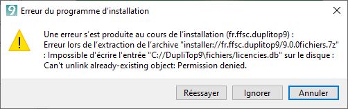 | Description | Cette erreur peut survenir au moment de l'installation si l'une des bases Licencies, Tournois ou FFSc est verrouillée. Cela peut se produire si Arbitrage, DupliGest ou Lanceur est en cours d'exécution, ou si l'un des processus correspondants tourne encore après que le programme a planté. | ||||