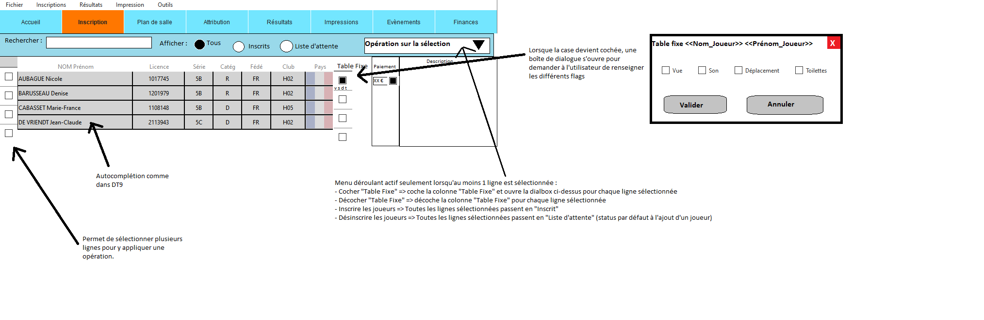 | Description | Proposition d'une interface minimaliste reprenant le comportement similaire au 1 seul tableau d'inscription des joueurs dans Duplitop9. Le tableau prendra l'ensemble de largeur de l'onglet et 90% de la hauteur.