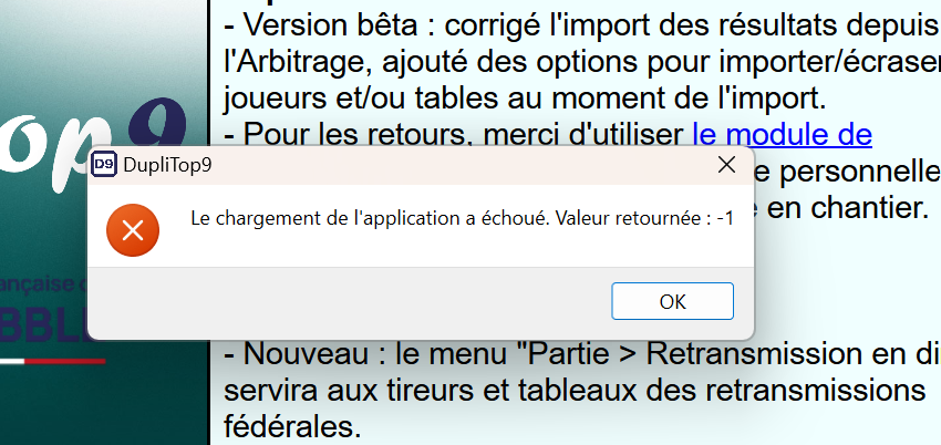 Il semblerait que votre sauvegarde soit corrompue. Pouvez-vous faire parvenir votre fichier C:\DupliTop9\arbitrage.db à webmestre@ffsc.fr pour que je l'examine et que je puisse vous renvoyer une version corrigée . Si vous ne souhaitez pas conserver les parties précédemment arbitrées, vous pouvez aussi simplement supprimer ce fichier pour redémarrer l'Arbitrage sur une partie vierge. |
