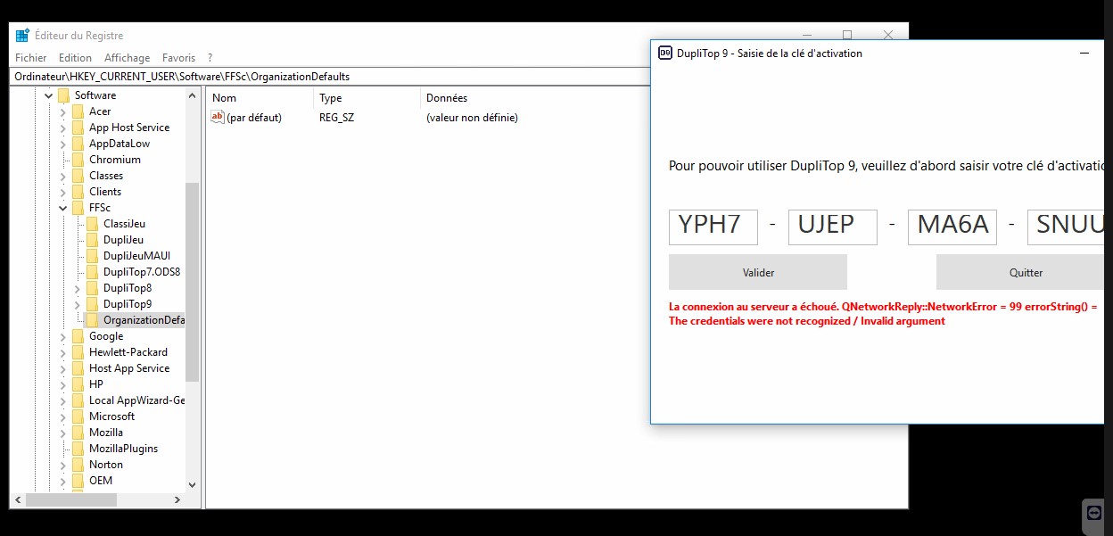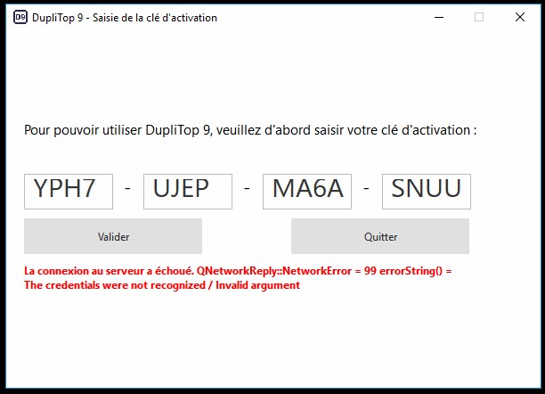| Description | Suite à la migration Windows 7 à Windows 10 sur une centaine d'ordinateurs, l'apparition d'un bug QNetWorkReply::NetworkError = 99 errorString() = The Credentials were not recognized est apparue et continue de progresser (ça touche environ 20 personnes pour le moment). L'utilisateur qui a ce bug ne peut pas activer sa clé d'activation sur DupliTop 9. Il existe deux solutions pour résoudre ce bug :