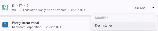 | Description | Avec Windows 11, une tentative de désinstallation de DupliTop 9 par la fenêtre "Applications installées" n'a pas d'effet. En cliquant sur "Désinstaller", on voit une fenêtre s'ouvrir et se fermer aussitôt. | ||||