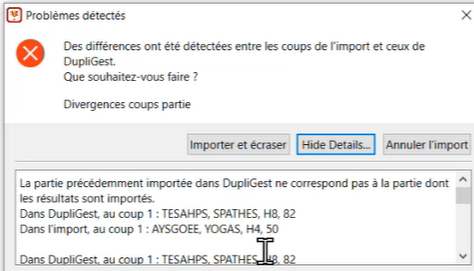 | Description | Voir vidéo <a href="https://duel-de-mots.com/ffsc/dupligest/videos/crbretagne2025/DupliGest%20-%20CRBretagne2025%20-%20importation%20des%20r%C3%A9sultats%20de%20la%20partie%201.mp4">importation des résultats de la partie 1</a> (à 2' du début). (Scénario reproductible depuis <a href="https://duel-de-mots.com/ffsc/dupligest/videos/crbretagne2025/">utilisation de DupliGest au championnat régional de Bretagne 2025</a> ) | ||||