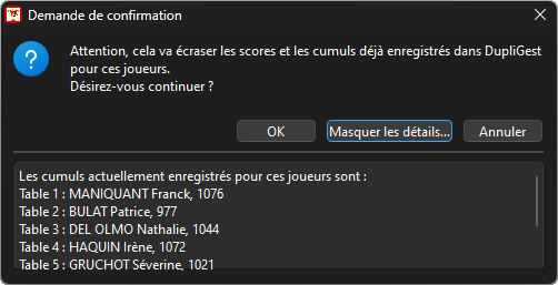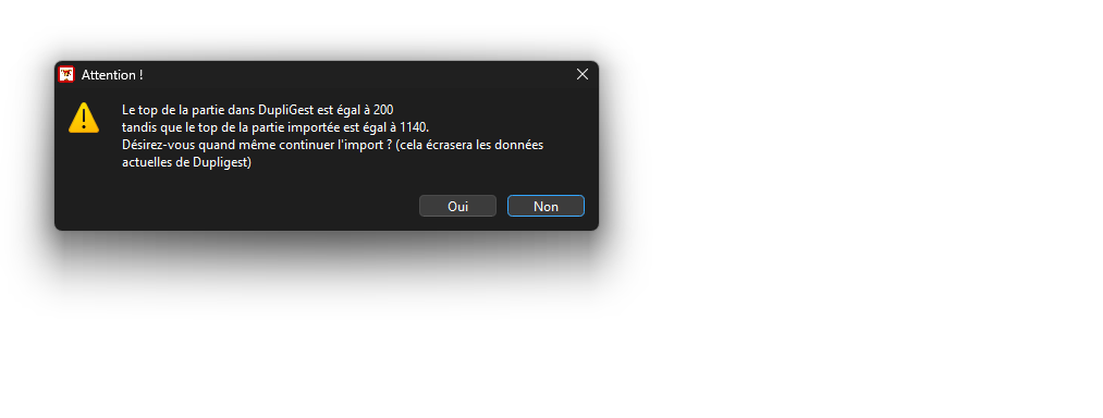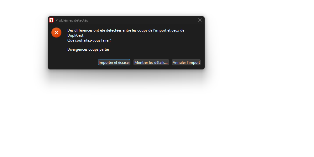 Mais cette solution entraine d'autres potentiels problèmes / bugs De tout façon en cas d'erreur d'import l'utilisateur peut quand même saisir les cumuls manuellement dans DupliGest. j'ai également provoqué ce message d'erreur en tentant d'importer sur la mauvaise partie (capture 4). Visiblement ce message apparait pour les parties > 1. Cela touche également au ticket 0001713 (https://bugs.ffsc.fr/view.php?id=1713) je ne pense pas que se soit une bonne idée d'être moins strict sur les imports de résultats pour les raisons évoquées ci-dessus. Au contraire je pense qu'il faut être strict car actuellement on est dans un "entre deux" qui peux entrainer des incohérences et des problèmes d'intégrités des données dans DupliGest. |