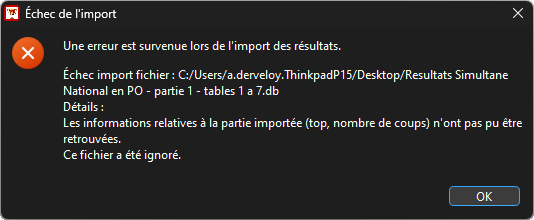 Merci pour ce tour d'horizon. Reste quand même une amélioration possible : rendre plus explicite le message de la fenêtre "Échec de l'import" en fonction des incohérences rencontrées (tournoi, n° de partie…). |
