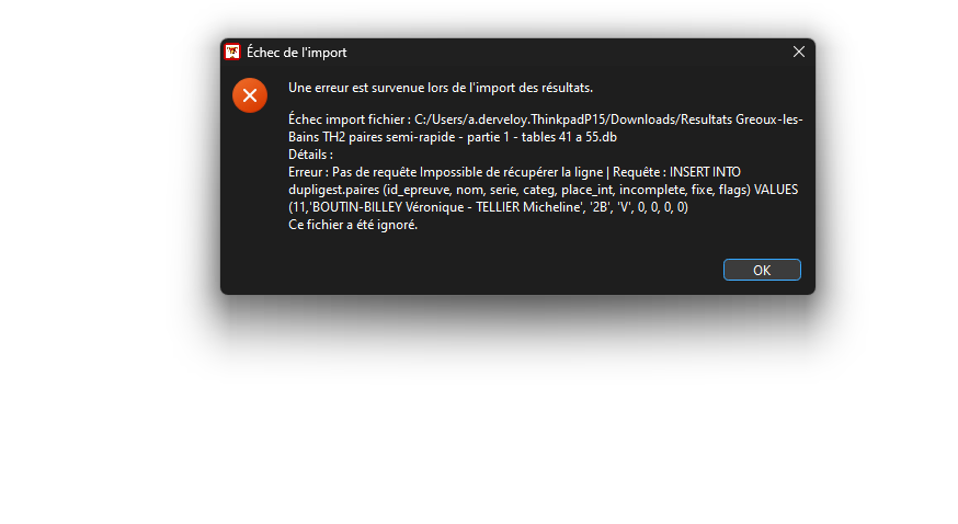 | Description | Suite à test à Gréoux les bains l'import des paires ne fonctionne pas. voir capture ci-jointe. | ||||