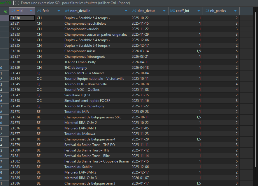 Les informations présentes dans la liste des tournois FISF est trop peu détaillé ( voir capture FISF). La structure de la base tournoi FFSc (voir capture) est détaillé et certaines informations sont indispensables. |