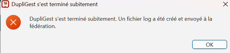 | Description | Au démarrage, saisir BERGERON Paul (ou MUSTER Yvan ou JEANNERET Patrice) puis cliquer sur le bouton "Connexion". La fenêtre principale DupliGest s'ouvre ... mais se referme tout de suite (voir boite de message en PJ). Bizarrement pas de problème pour les joueurs belges. | ||||