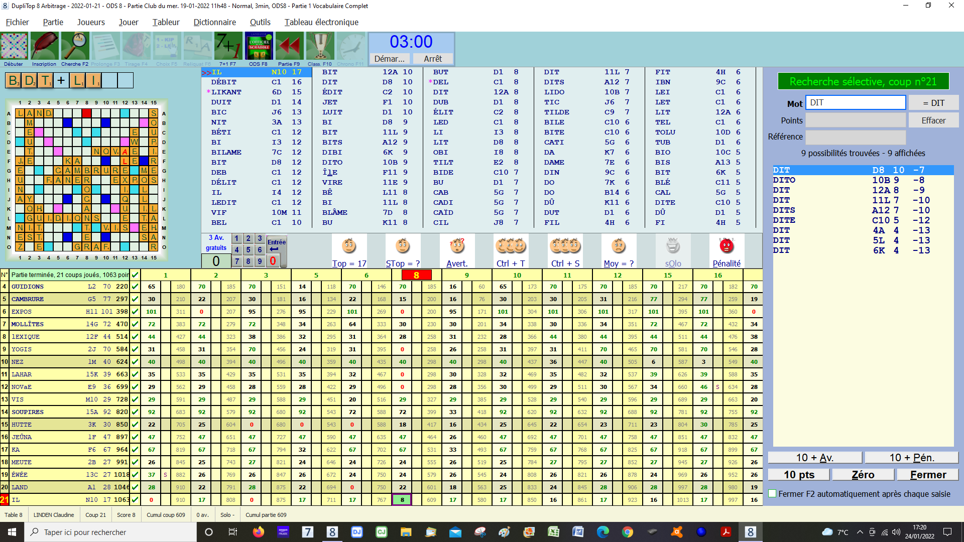 Exemple, je me positionne sur un mot autre que le top je valide par "Return" le pavé d'avertissement "Le score de ce joueur est déjà renseigné" s'ouvre bien mais en même temps la solution que je propose disparait et le curseur se met sur le top. Si je valide c'est le top qui s'inscrit. Idem en cliquant deux fois sur le mot, idem en inscrivant dans le MOT. |